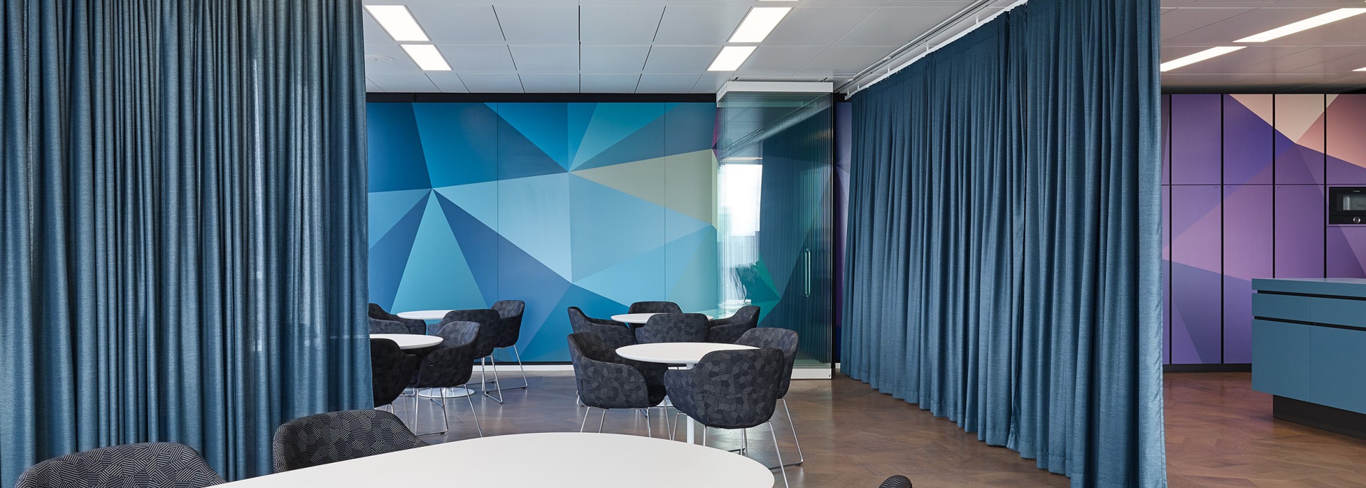 På lydgardiner der hænger frit i rummet, syr vi poteirhoved og franske sømme, der sikrer at gardinet er flot såvel forfra som bagfra.